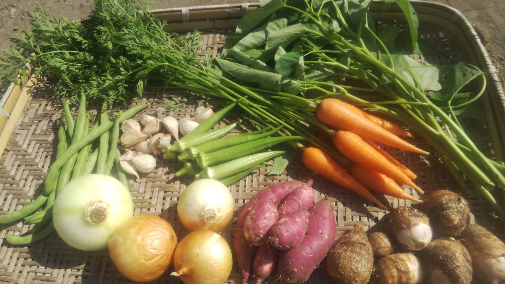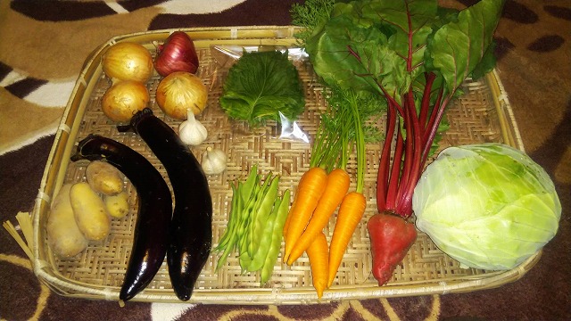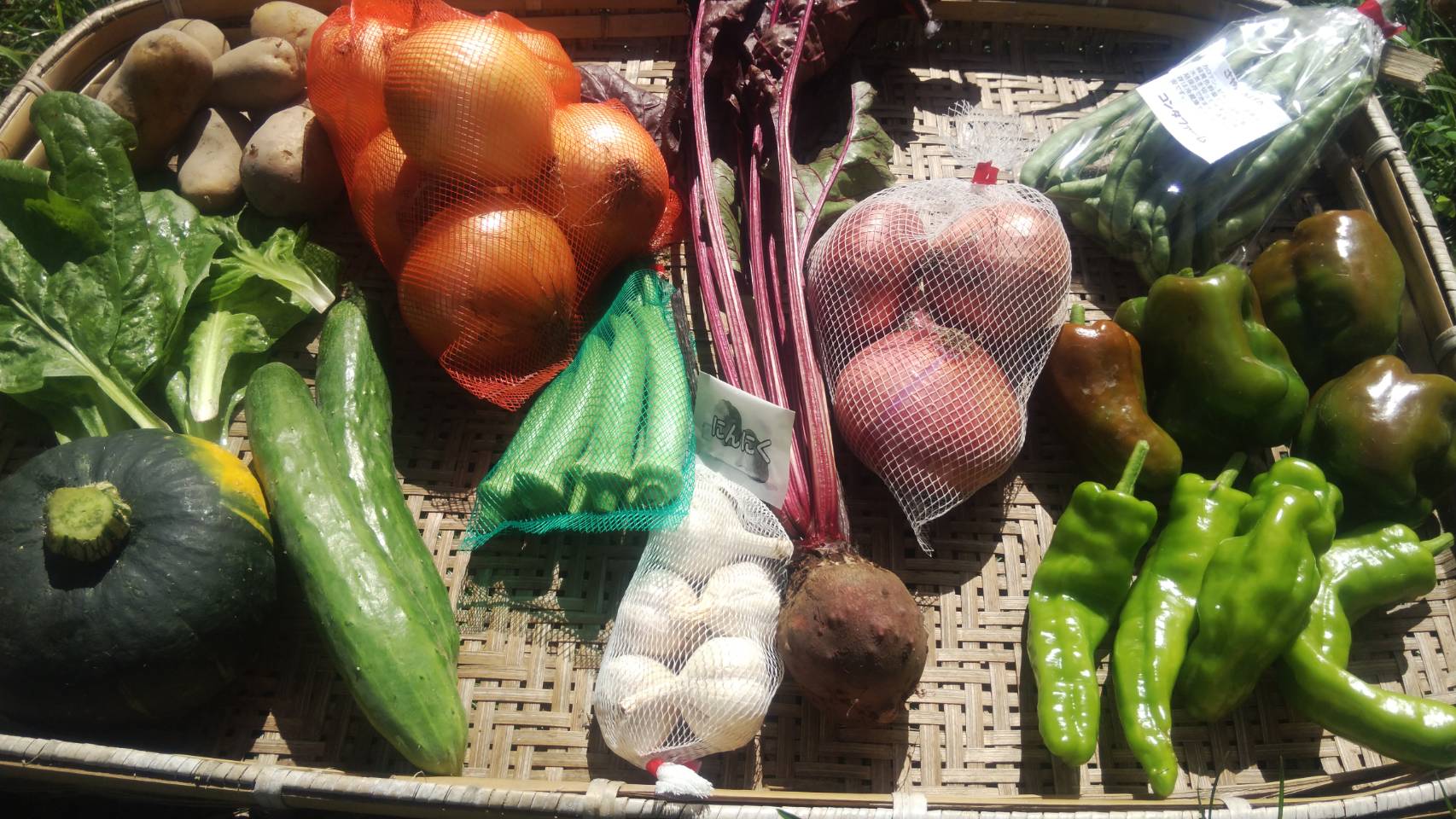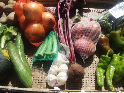 <こだわりポイント> 8月のお野菜は、 オクラ、ニンニク、キュウリ、じゃがいも、玉葱、空芯菜、大葉、ミニかぼちゃ、ピーマン、甘唐辛子等です。
