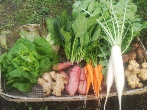<こだわりポイント> 12月前半分(里芋、さつまいも、大根、人参、菊芋、ほうれん草、リーフレタス、サラダ菜、生姜等) 農薬や化学肥料は使用せず、母なる大地と対話し、試行錯誤しながらのお野菜作り、形や大きさは不揃いですが、沢山の方に食べて頂けるように耕し続けます。